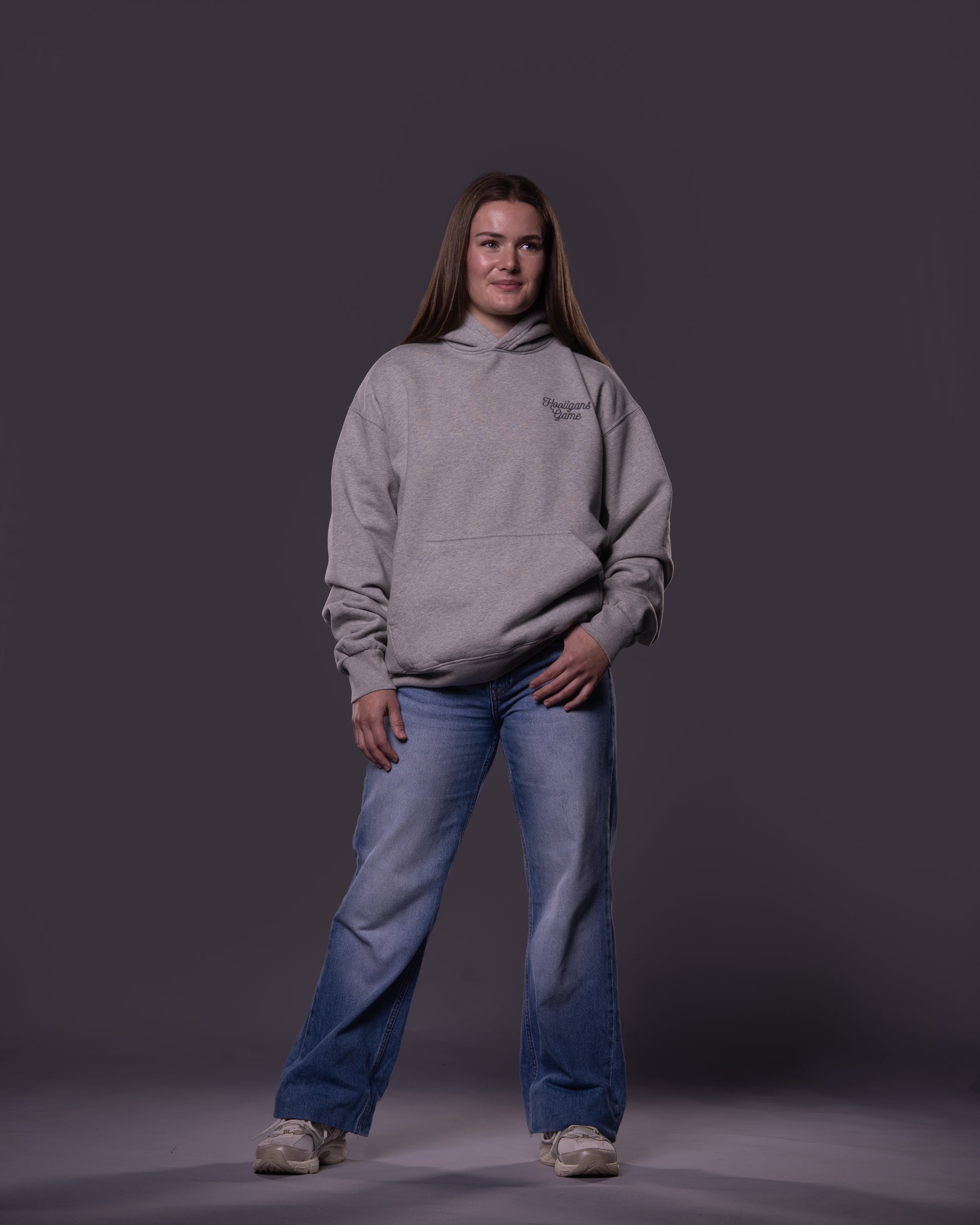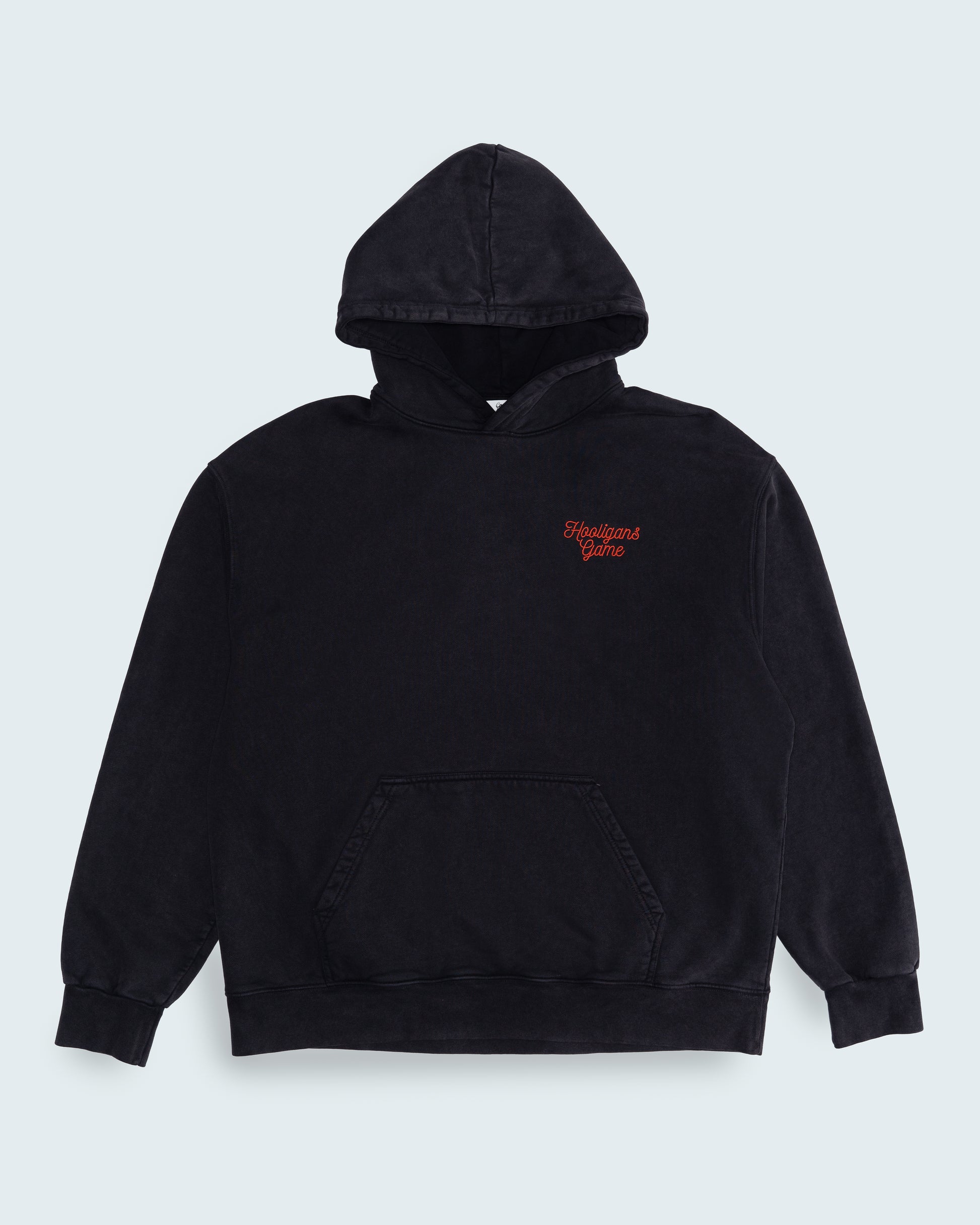 The Hooligan's game hoodie has an embroidery on the front left chest and a matching 3D print on the back.